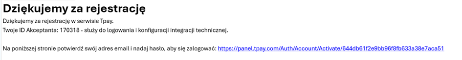 W wiadomości którą otrzymałeś od Tpay znajduje się link dzięki któremu potwierdzisz swój adres email i nadasz swoje indywidulane hasło