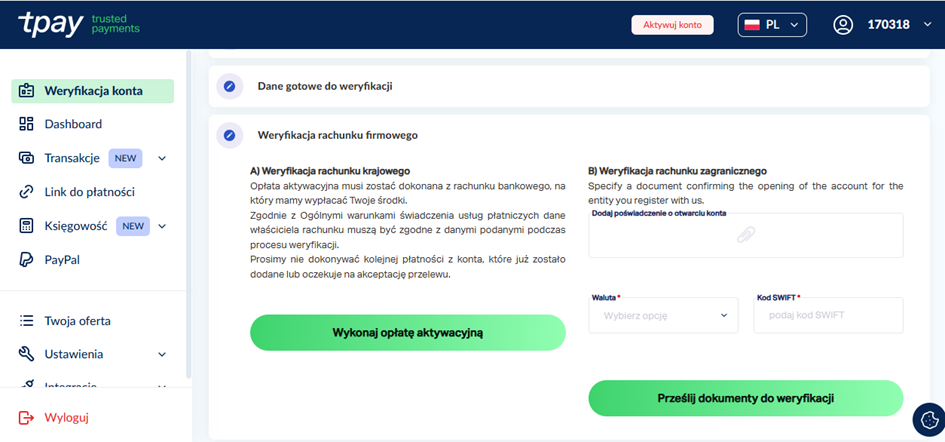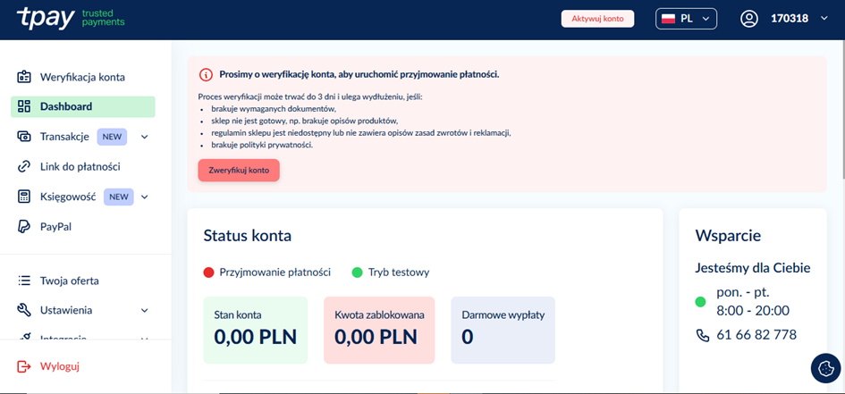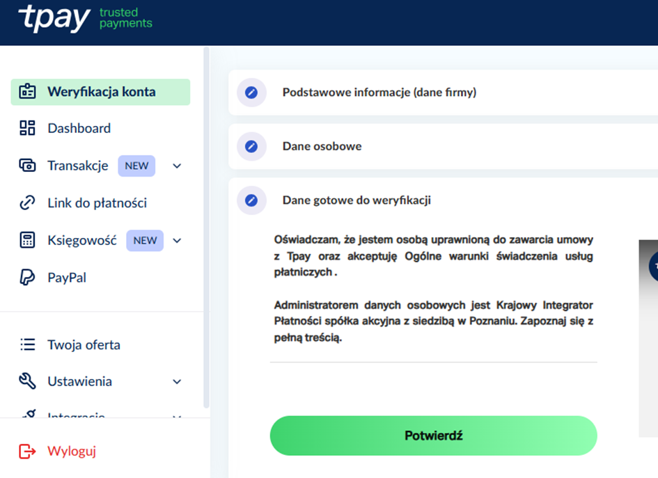 Jesteś już w panelu Tpay, Twoje konto jest aktywne, ale wymaga weryfikacji, abyś mógł przyjmować płatności.