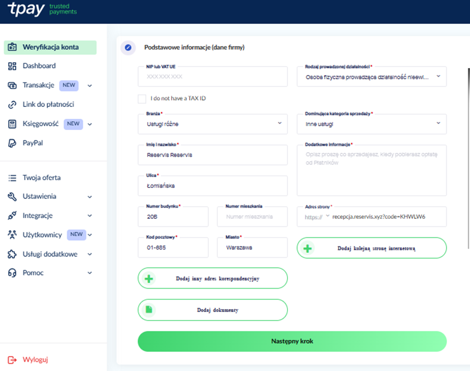 Kliknij przycisk Zweryfikuj konto aby rozpocząć ten proces. W pierwszym kroku, Tpay poprosi cię o zaznaczenie jaką formę działalności prowadzisz, branżę w jakiej pracujesz, dominującą kategorię sprzedaży czy dodatkowe informacje. Jak widzisz, dane które wypełniałeś w Reservis są już wprowadzone.
