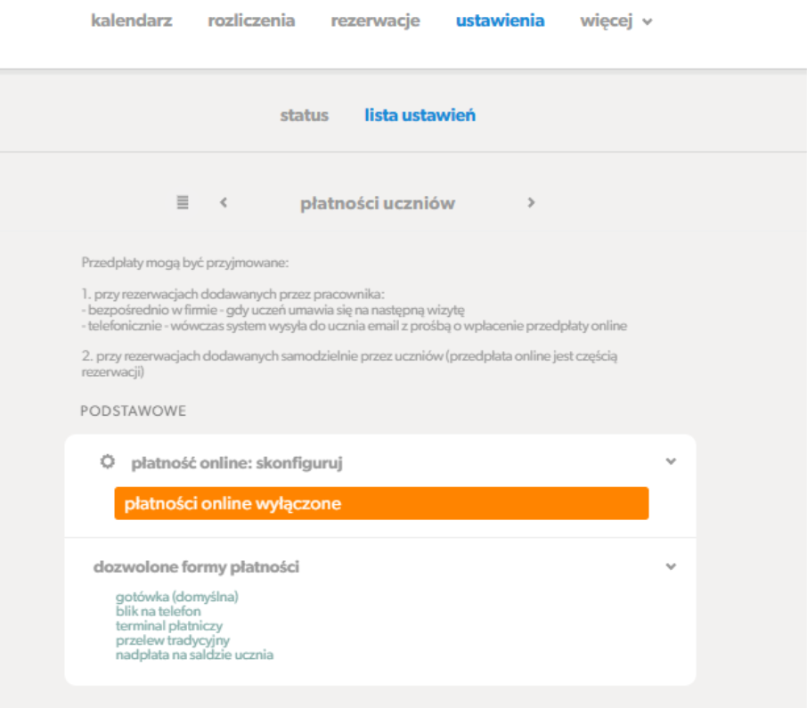 Uruchomienie płatności online w Reservis jest bardzo proste. Wystarczy, że wejdziesz w Ustawienia – Lista Ustawień – Płatności Klientów lub Płatności Uczniów jeżeli działasz w branży edukacyjnej.