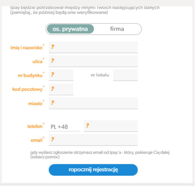 Korzystamy z Tpay, który umożliwia założenie konta również osobom prywatnym, nie prowadzącym działalności gospodarczej, lub prowadzącym nie rejestrowaną działalność. W zależności od tego, na jakich zasadach Ty pracujesz, poprosimy się o dane wymagane dla osoby prywatnej