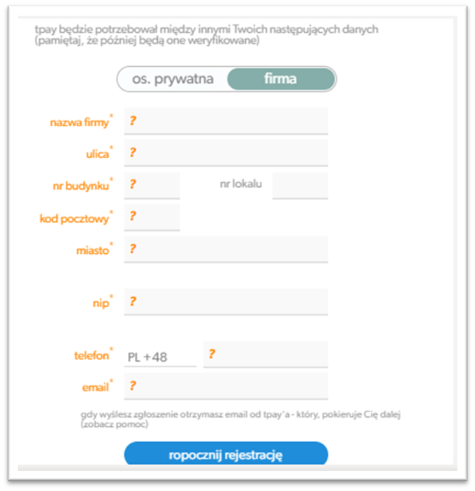 Gdy już wypełnisz wszystkie dane, wystarczy że klikniesz przycisk rozpocznij rejestrację aby rozpocząć uruchamianie płatności online.